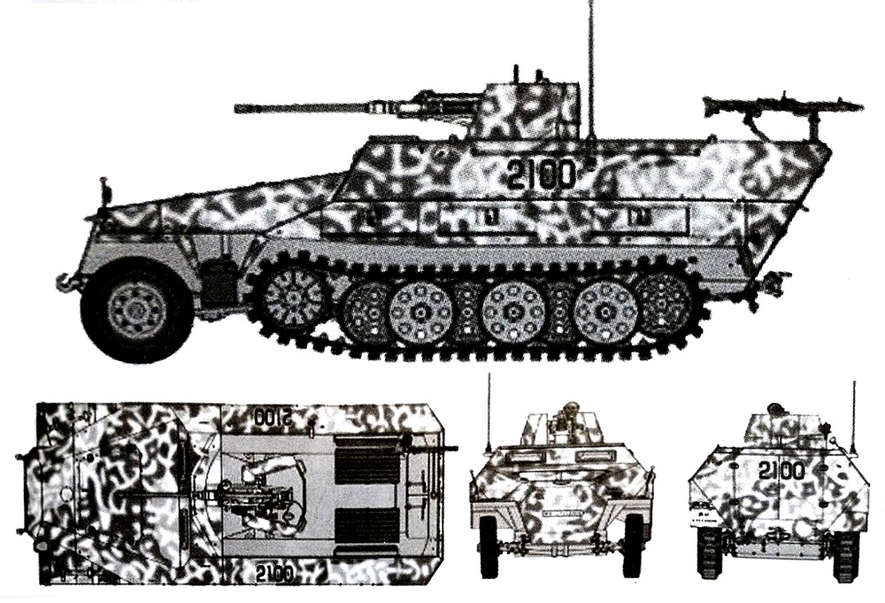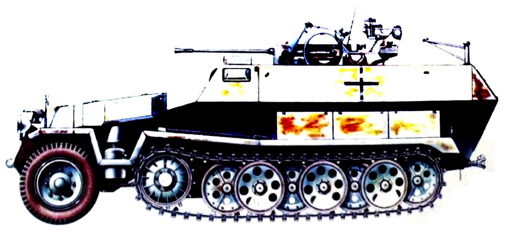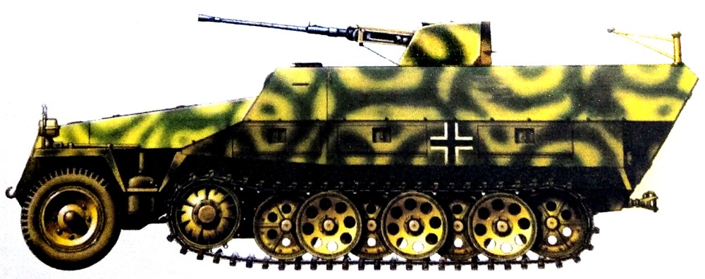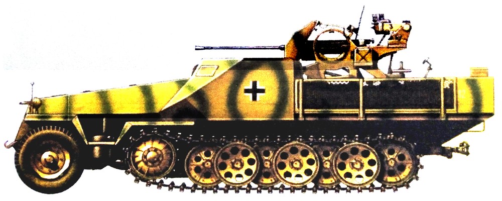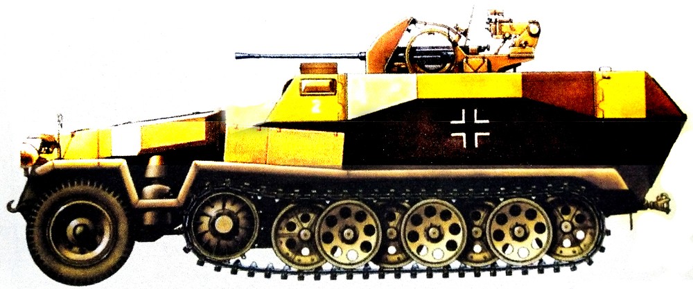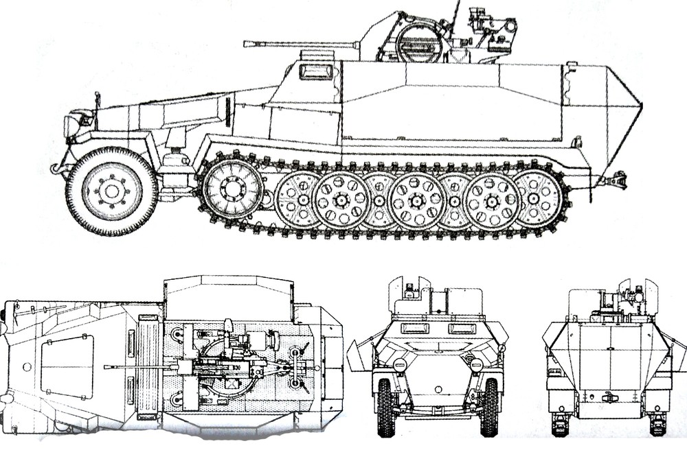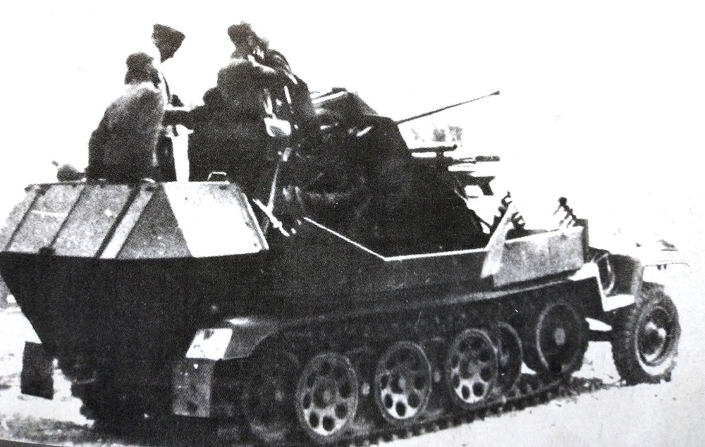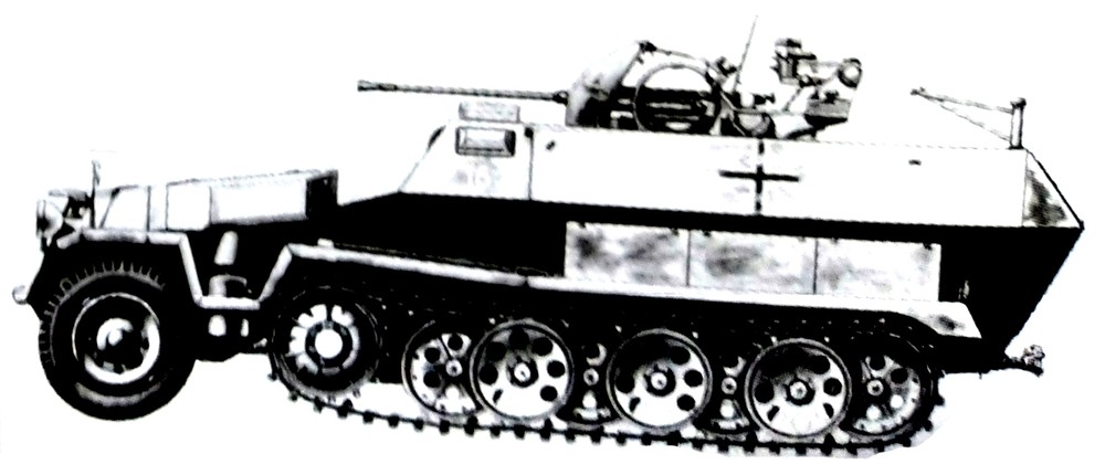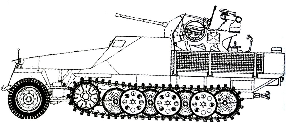 该炮车用251/1 C型改装,该车对车厢进行了改造,车厢中部两侧的装甲板在对空作战时可以放平,使防空炮在射击时可作360°转动,让防空炮的战斗力得到充分发挥。