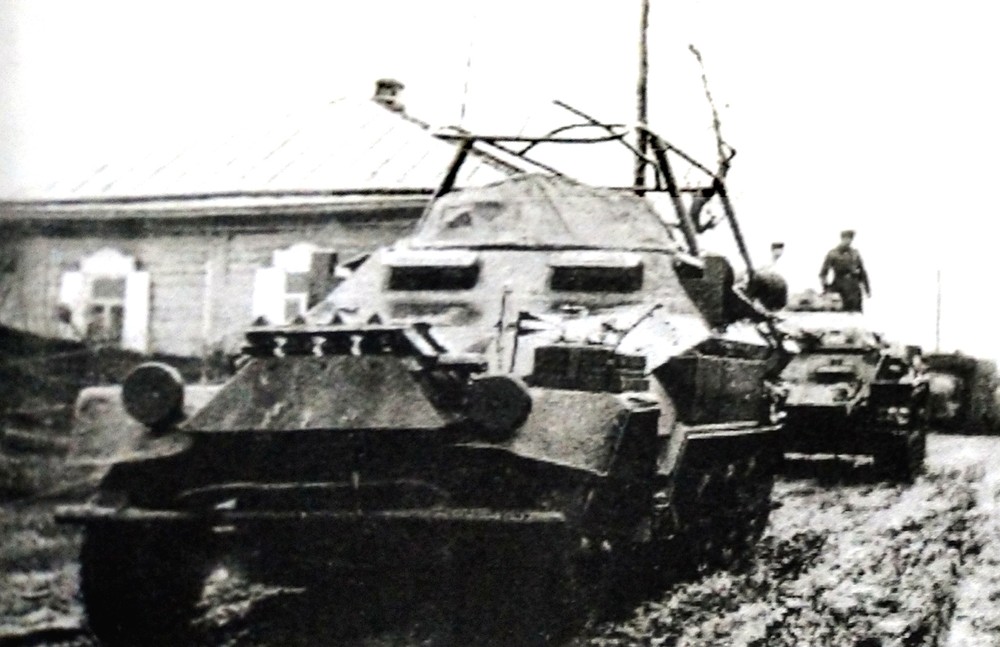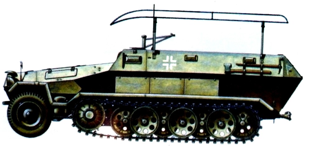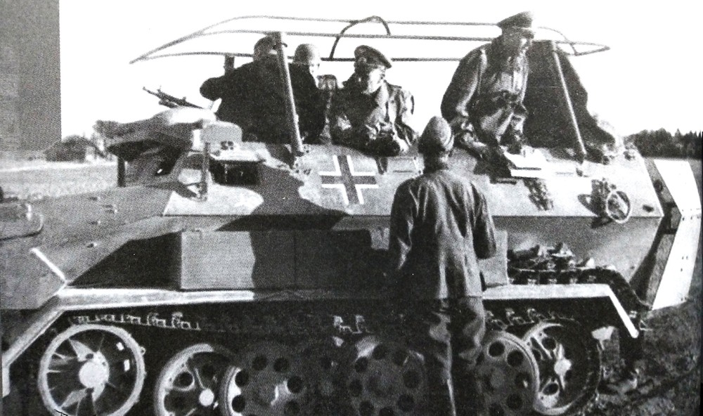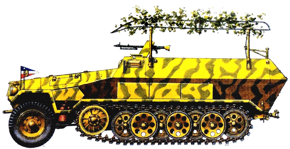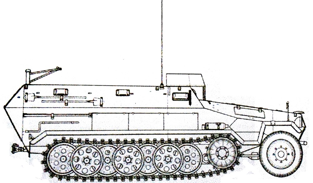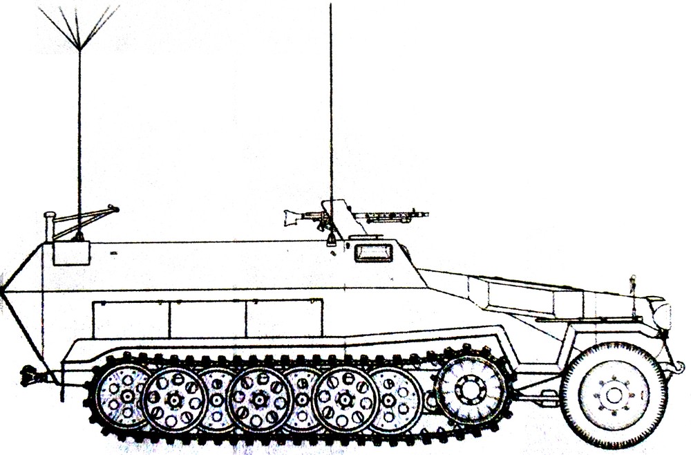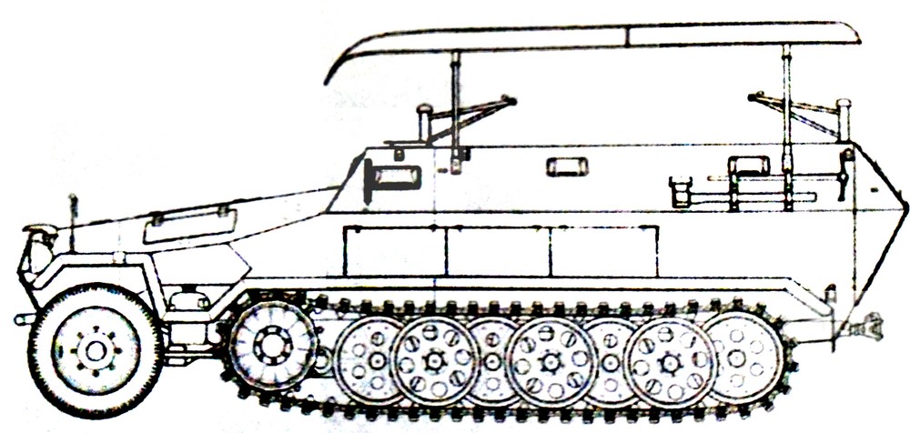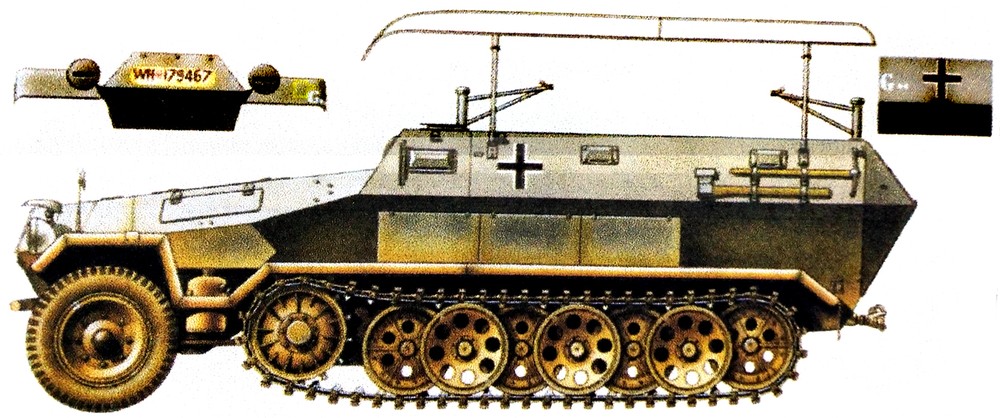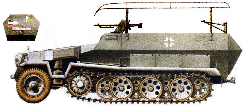 这是使用251 C型车体改装的251/6半履带装甲指挥车,1943年后,该型车大多会改为同时装备FuG12型与FuG19型2台大功率电台,其安装的天线也从框架天线改装为星形天线。