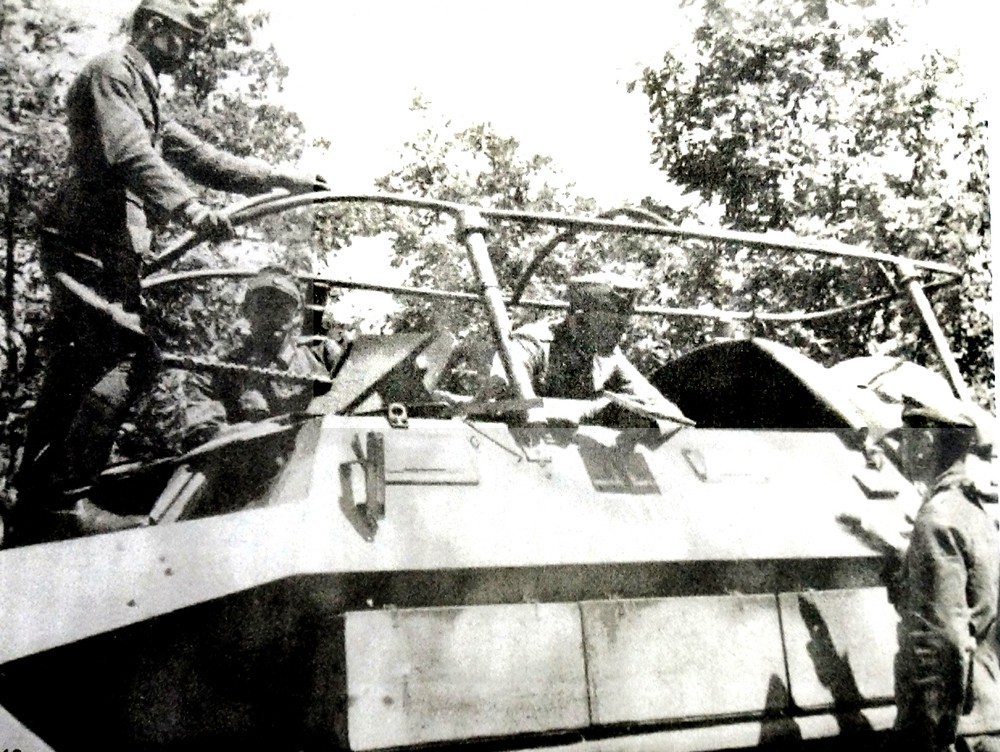 这是使用251 A型车体改装的251/6半履带装甲指挥车,该车战斗全重8.5吨,核载乘员6~8人,有正、副驾驶员各1人,负责电台收发报的通讯员2人,还有密码机操作员1人以及2名高级军官,前置机枪射手一般由副驾驶(下级军官)兼任。