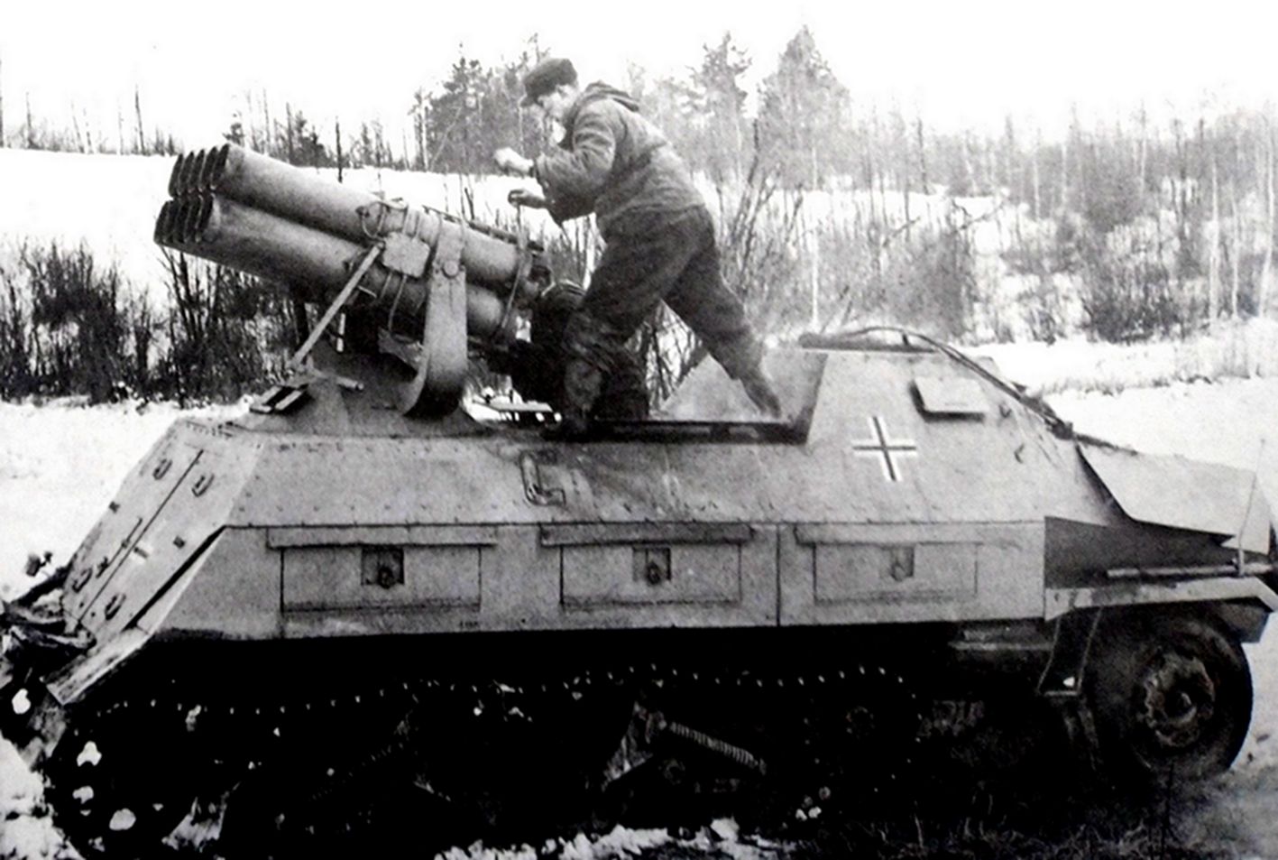 1943年,德军将42型150mm双排式火箭炮安装在Sd.Kfz 4/1半履带装甲车上,成为一种车载火箭炮。该车载火箭炮经战场检验显示了极好的机动性与较强的战斗威力,于1944年5月全面装备给一线部队。